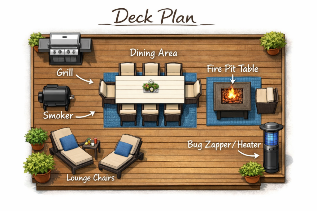 - Defined zones (dining, lounging, grilling)